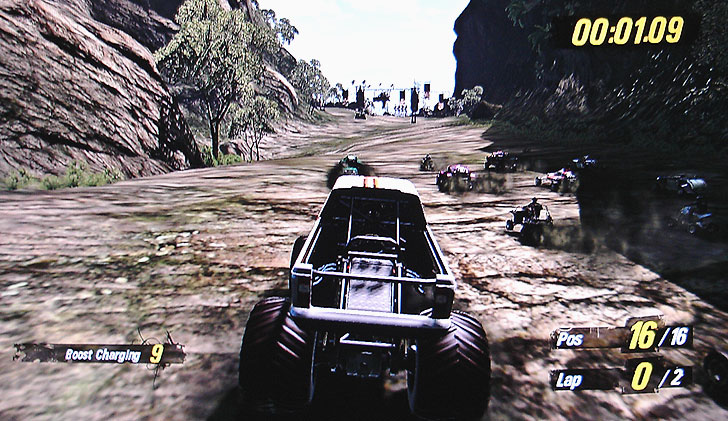 挙動が前作と微妙に異なっていて、曲がりにくいというか若干滑りやすい感じがする…この辺は慣れでしょうか。グラはテクスチャがきめ細かくなって岩っぽい質感が増したような感じも受けるが全体的にあまり変わってないような印象、今回のデモはかなり古いバージョンとも聞くので製品版ではクオリティアップしているのだろうか?早くオンでモンスタートラックを乗り回したい。