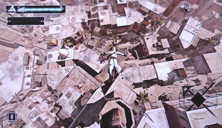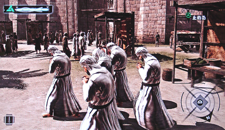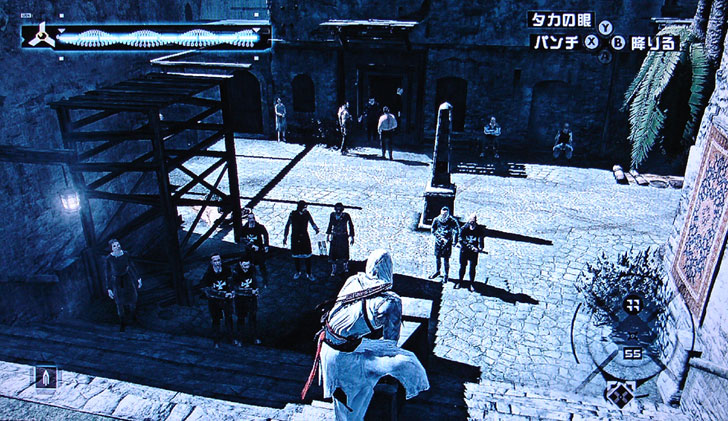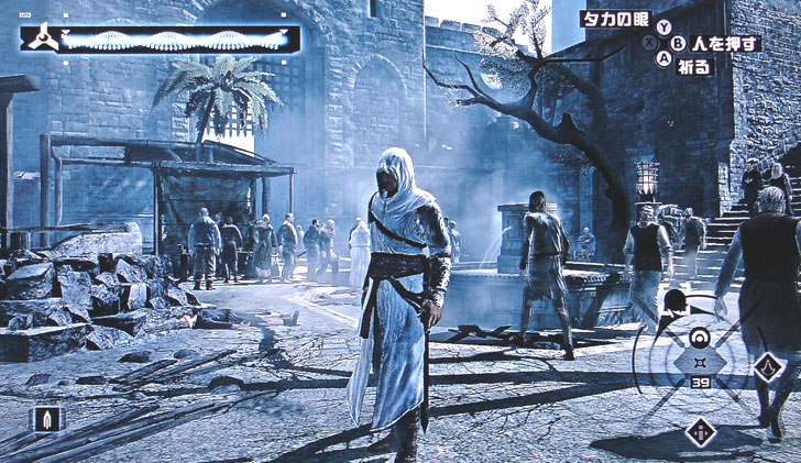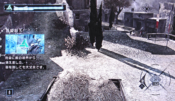 ジャンルとしてはステルスゲームではあるが、あまり”ステルス”の部分は特化していないように思える。敵兵は街中にいるが目立つ行動を取らなければ視界に入っても気づかれることはあまりない。既存のステルスゲームのように敵に見つからないように身を潜めながら敵を討つ…という感覚ではなく(場面によってはそういうプレイも必要だが)、見つかったら群集やステルスポイント(ワラの中や屋上庭園など)に身を潜めて敵を撒く、という感覚が強い。