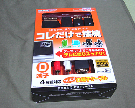 ゲームテックの4機種対応D端子ケーブルを買った。D端子セレクタと全ハード用のケーブルの出力がひとつになった優れものだ。箱にD端子ケーブルを差してもHDMIが隠れないって仕様が素晴らしい(純正のだとケーブルカバーが大きすぎてHDMIを塞いでしまう)。機能面では文句ないけどセレクタから各ゲーム機へのケーブルが50cmしかないのが不満だな、1mぐらいはあるとゆったりして良かったんだけども。